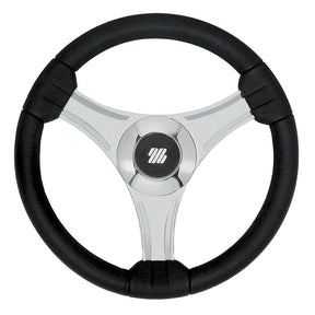 This Uflex Tavolara steering wheel is a 3-spoke boat steering wheel with aluminum anodized silver spokes and a polyurethane leather-look grip.