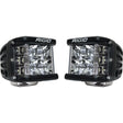 One of RIGID's most versatile, compact lighting solutions just got better with the RIGID D-SS PRO, Dually-Side Shooter Professional Race Output LED pod. Perfect for any application that requires a wide spread beam, including A-Pillars, Fog Lights, and motorcycle applications. The D-SS PRO incorporates powerful optics and recently improved LED technology for greater output with the added benefit of additional LEDs aimed to the side for a much broader beam. The D-SS PRO packs a powerful punch with up to 102% more raw lumens depending on the optics chosen The D-SS PRO fixtures boast up to 120-degrees of horizontal lighting coverage when used in pairs or when used in the single light applications. The main forward-facing LEDs are available with RIGID's advanced Spot, Flood, or Driving optics, so there's a D-SS PRO lighting solution for nearly any application. The D-SS PRO LED lights are available in pairs with three side-shooting LEDs on one side of each fixture, or in single applications with a pair of side-shooting LEDs on both sides of the fixture. Only RIGID provides a broad, powerful lighting solution in such a compact package.