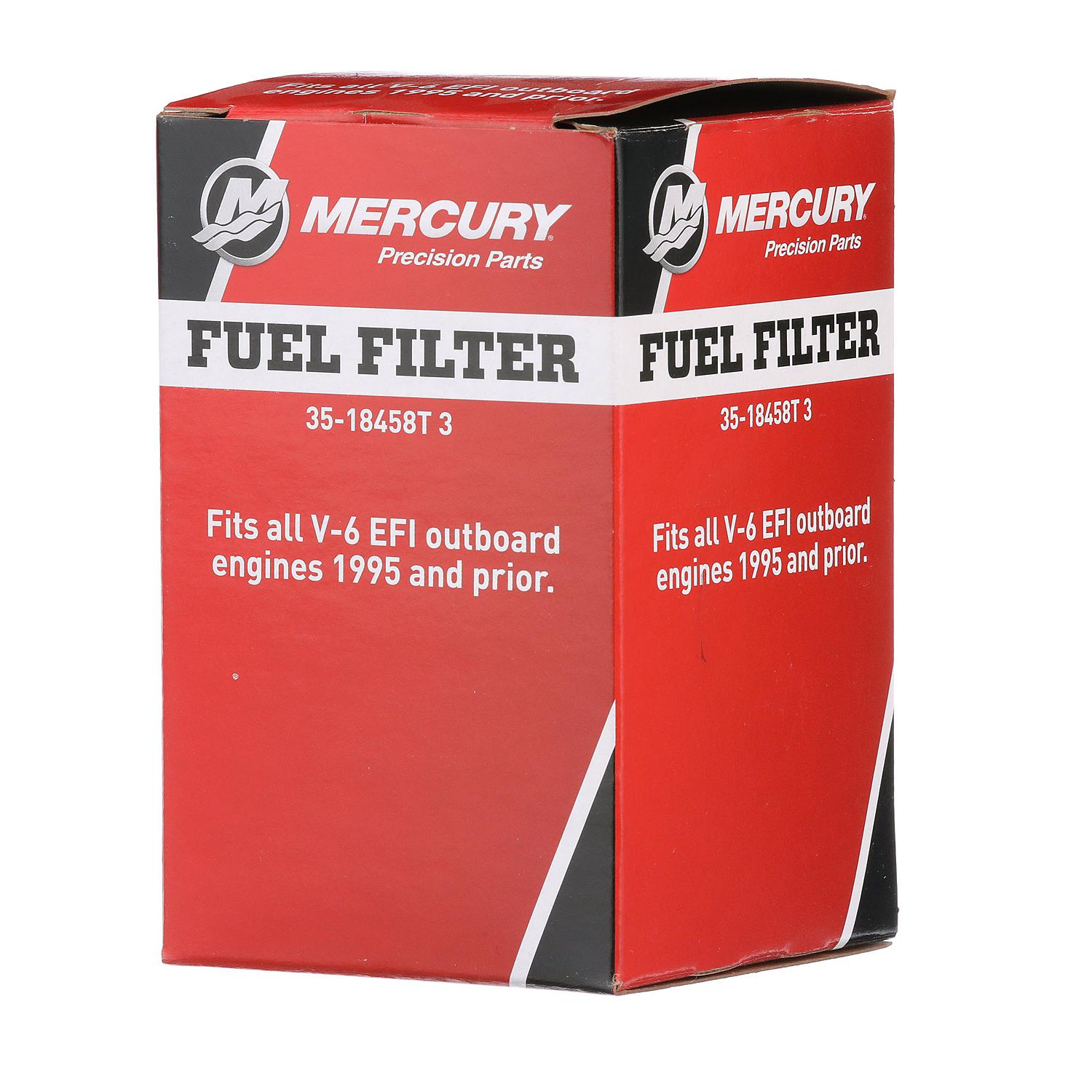 Mercury Replacement Water-Separating Fuel Filter 18458T3 helps protect your engine from debris and water while improving efficiency and engine economy. It is designed to fit 1995 and earlier Mercury or Mariner V6 EFI two-stroke outboards.