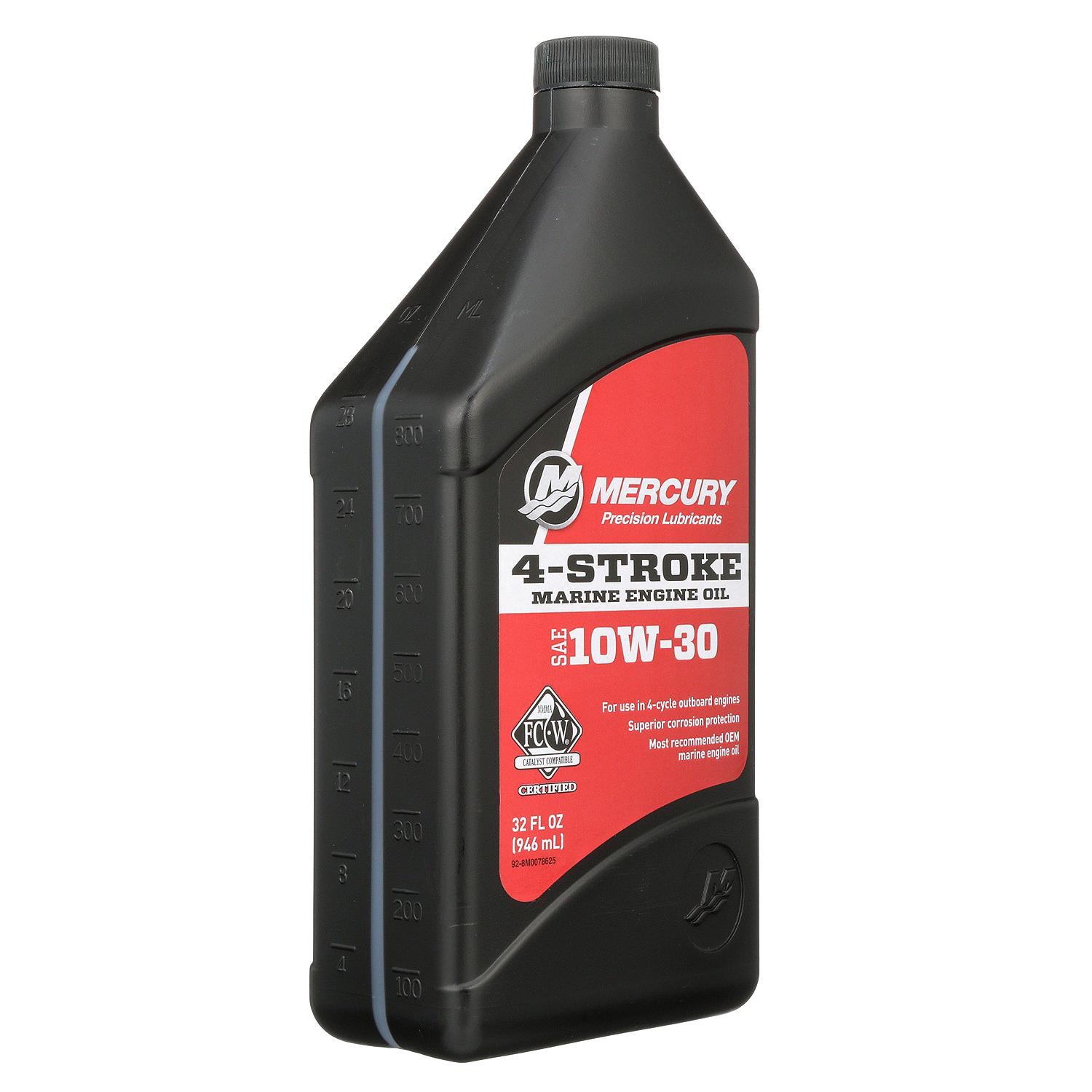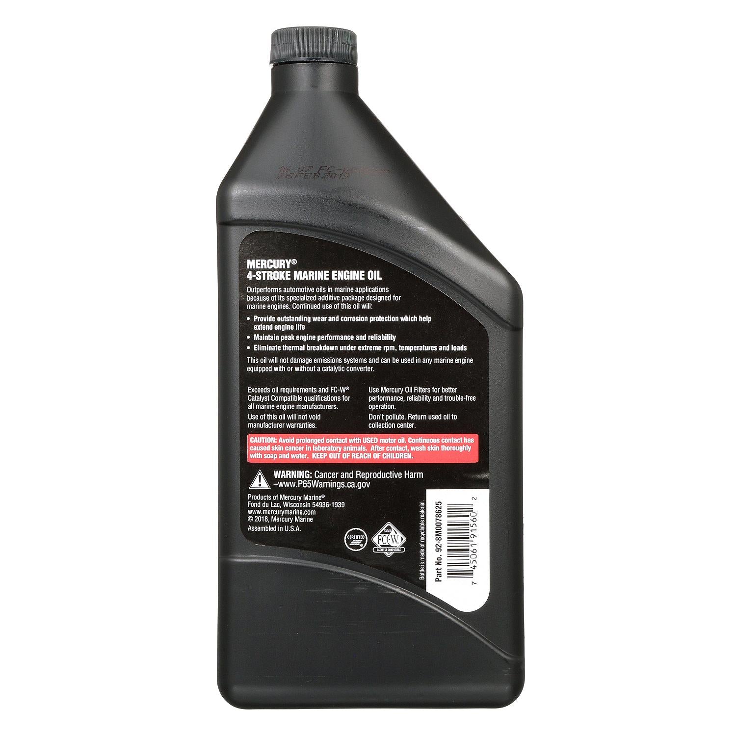 Marine engines operate in a harsh, corrosive environment that demands specialized protection you can't find in an automotive oil. Keep your engine operating at its peak with Mercury SAE 10W-30 Mineral 4-Stroke Marine Engine Oil 8M0078625. It features a specialized additive package that helps prevent corrosion, on and off the water. This mineral base oil exceeds all marine industry requirements four 4-stroke oil and is certified FC-W and FC-W Catalyst Compatible. It meets the manufacturer requirements for all 4-stroke marine engines when 10W-30 is called for.