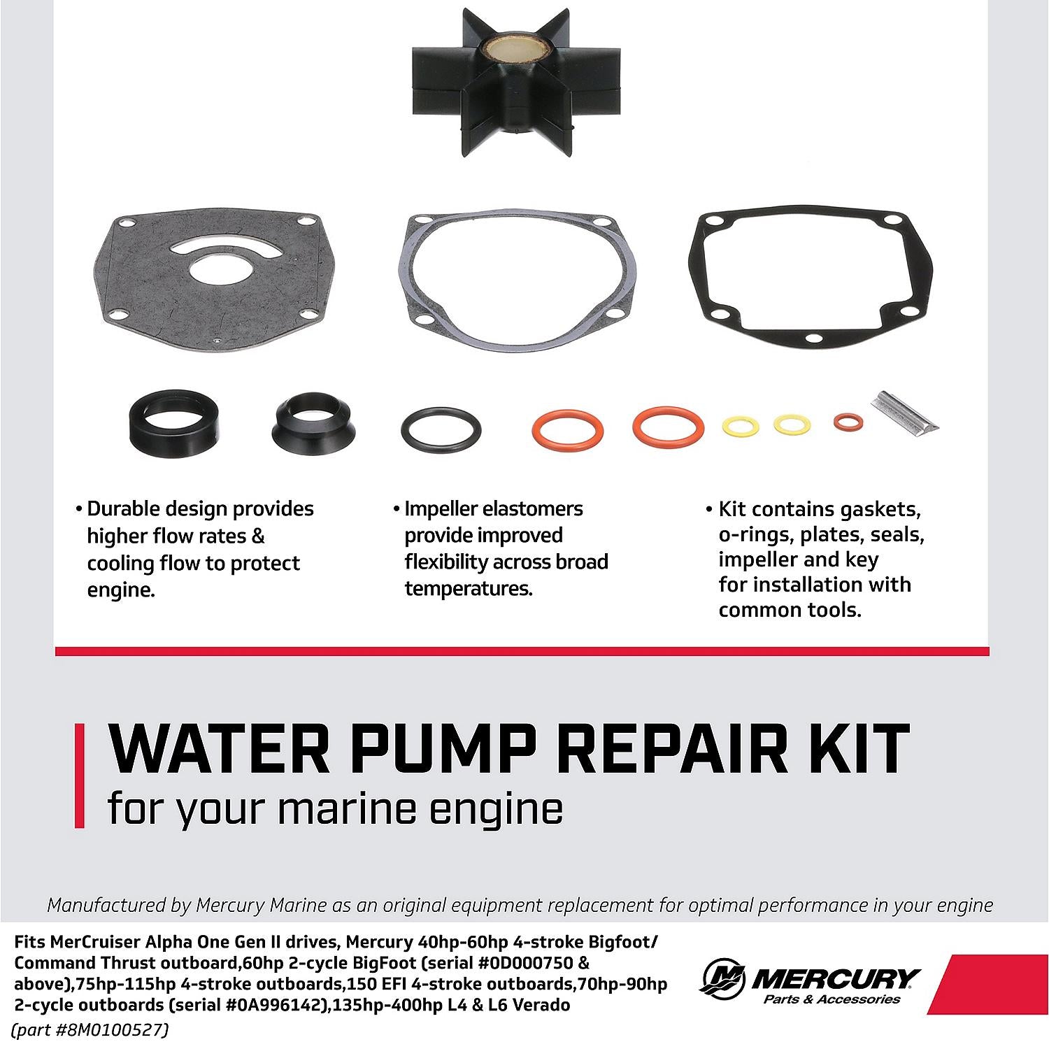 Mercury Water Pump Repair Kit 8M0100527 helps improve flow to your engine by repairing the damage that silt, sand and other abrasives can cause. It is designed to fit select Mercury or Mariner outboards and MerCruiser sterndrives.