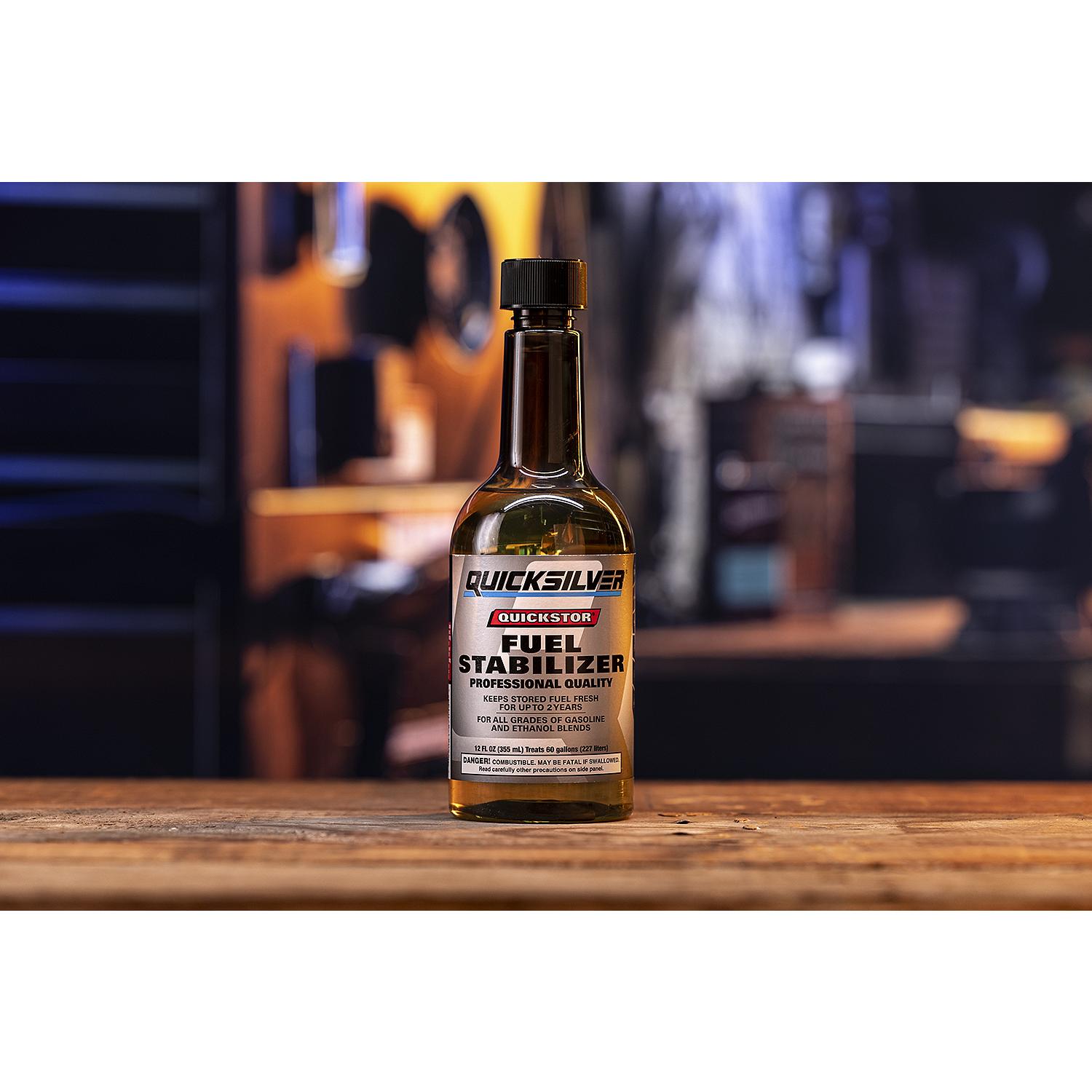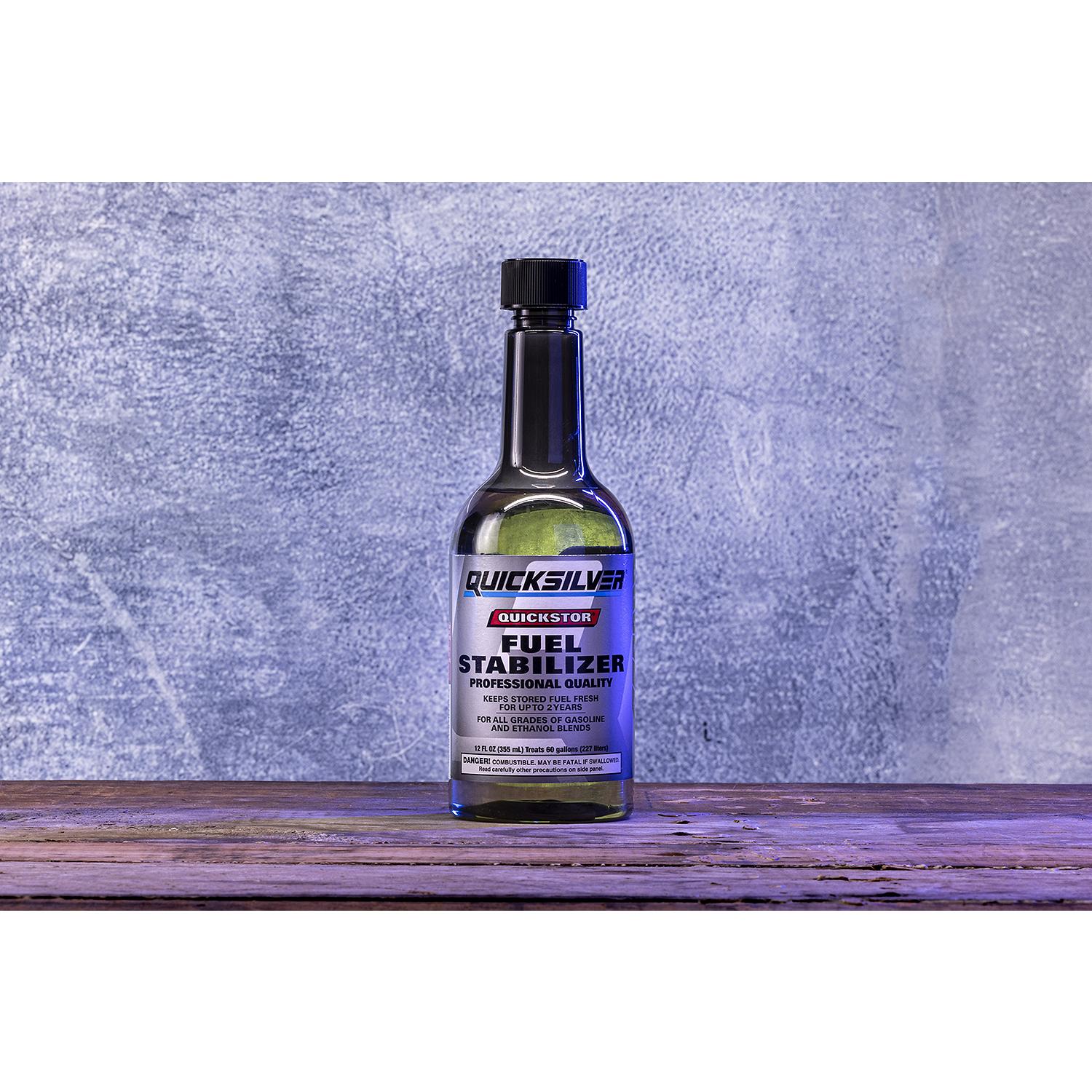 Quickstor fuel system treatment and stabilizer 8M0047922 is for use in all 2‑ and 4‑cycle carbureted and fuel‑injected gasoline engines including cars, trucks, motorcycles, ATVs, snowmobiles, marine engines, lawn mowers, chain saws, string trimmers and snow blowers. Safe for catalyzed engines. Add to fuel before long-term boat storage. Stabilizes fuel for up to one year. One ounce treats 5 gallons. Prevents regular and ethanol blended fuel from breaking down and oxidizing. Prevents fuel system corrosion. Prevents gum and varnish from forming in the fuel and then settling in fuel lines, tanks, carburetor and injectors.