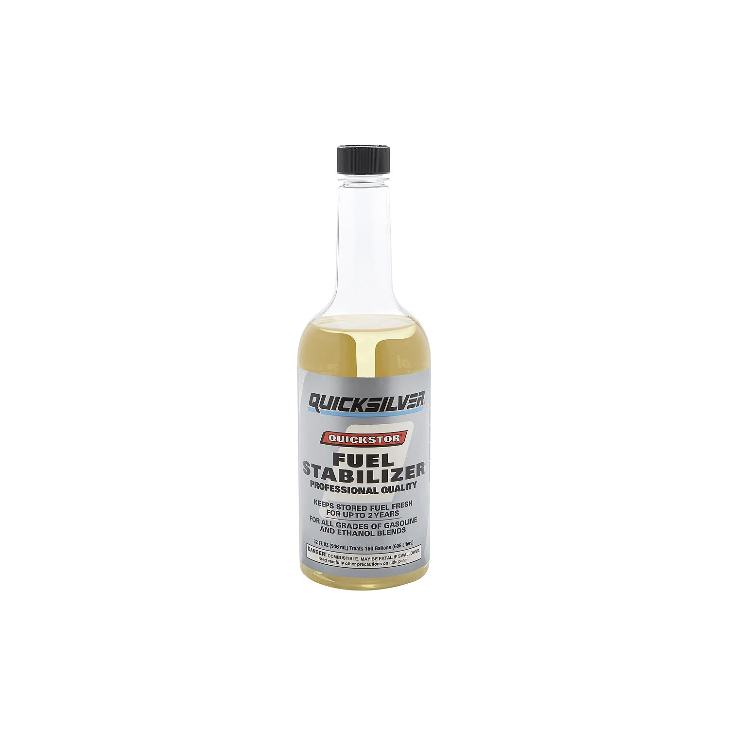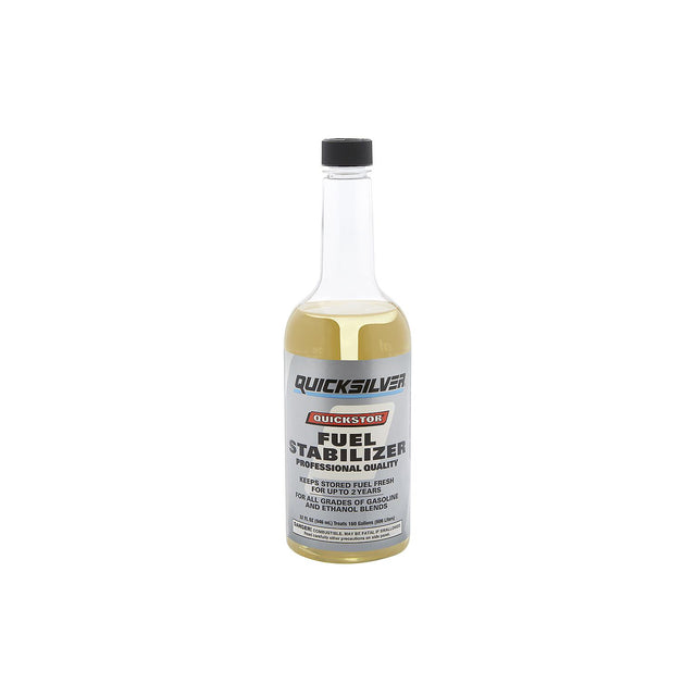 Quickstor fuel system treatment and stabilizer 8M0058682 is for use in all 2‑ and 4‑cycle carbureted and fuel‑injected gasoline engines including cars, trucks, motorcycles, ATVs, snowmobiles, marine engines, lawn mowers, chain saws, string trimmers and snow blowers. Safe for catalyzed engines. Add to fuel before long-term boat storage. Stabilizes fuel for up to one year. One oz. treats 5 gallons. Prevents regular and ethanol blended fuel from breaking down and oxidizing. Prevents fuel system corrosion and prevents gum and varnish from forming in the fuel and then settling in fuel lines, tanks, carburetor and injectors.