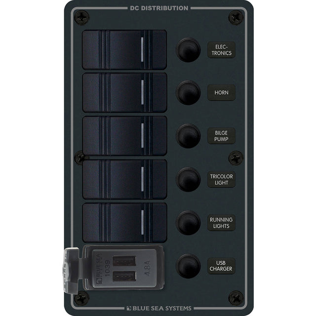 Blue Sea 8521 - 5 Position Contura Switch Panel w/Dual USB Chargers - 12/24V DC - Black [8521]